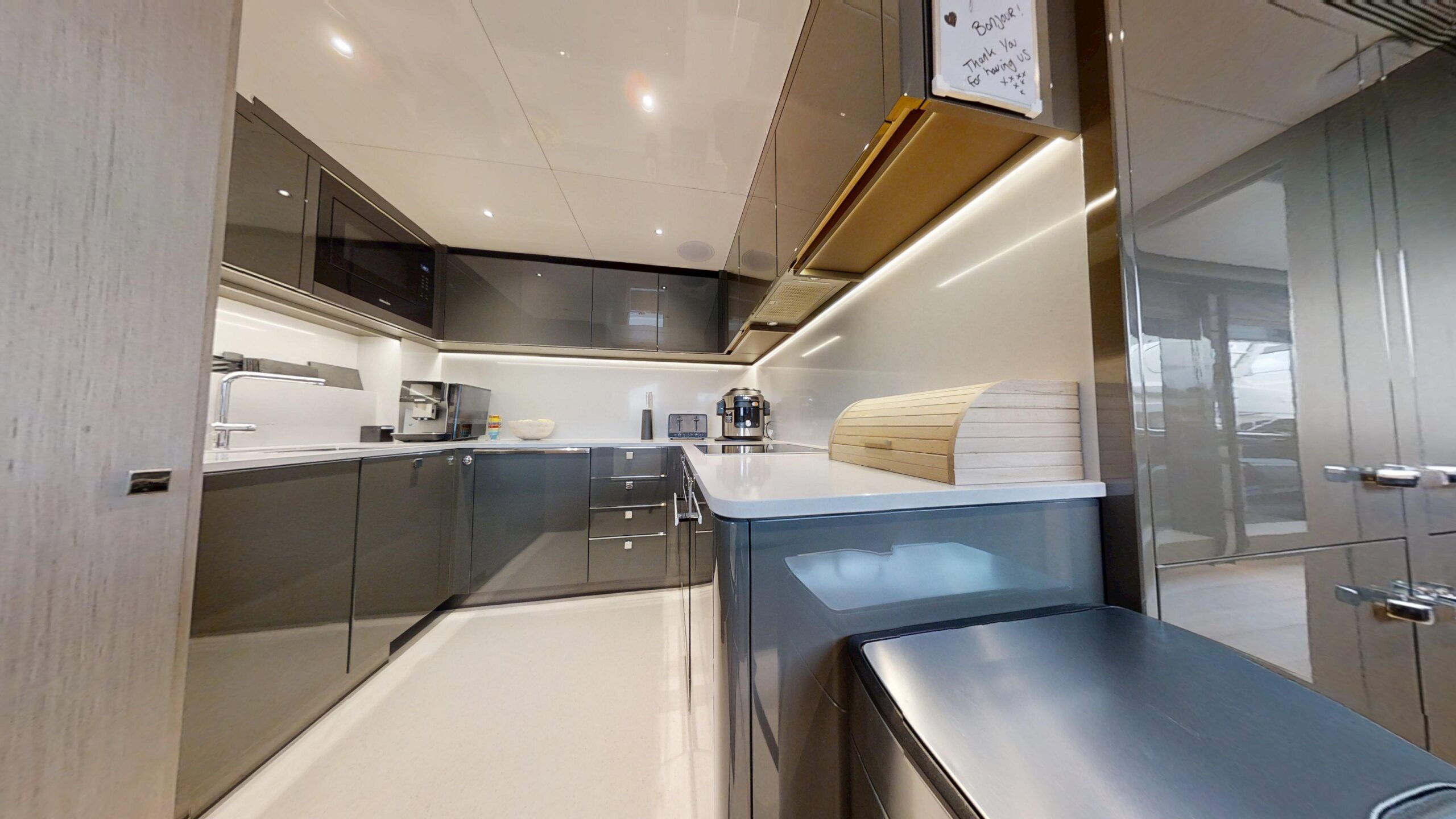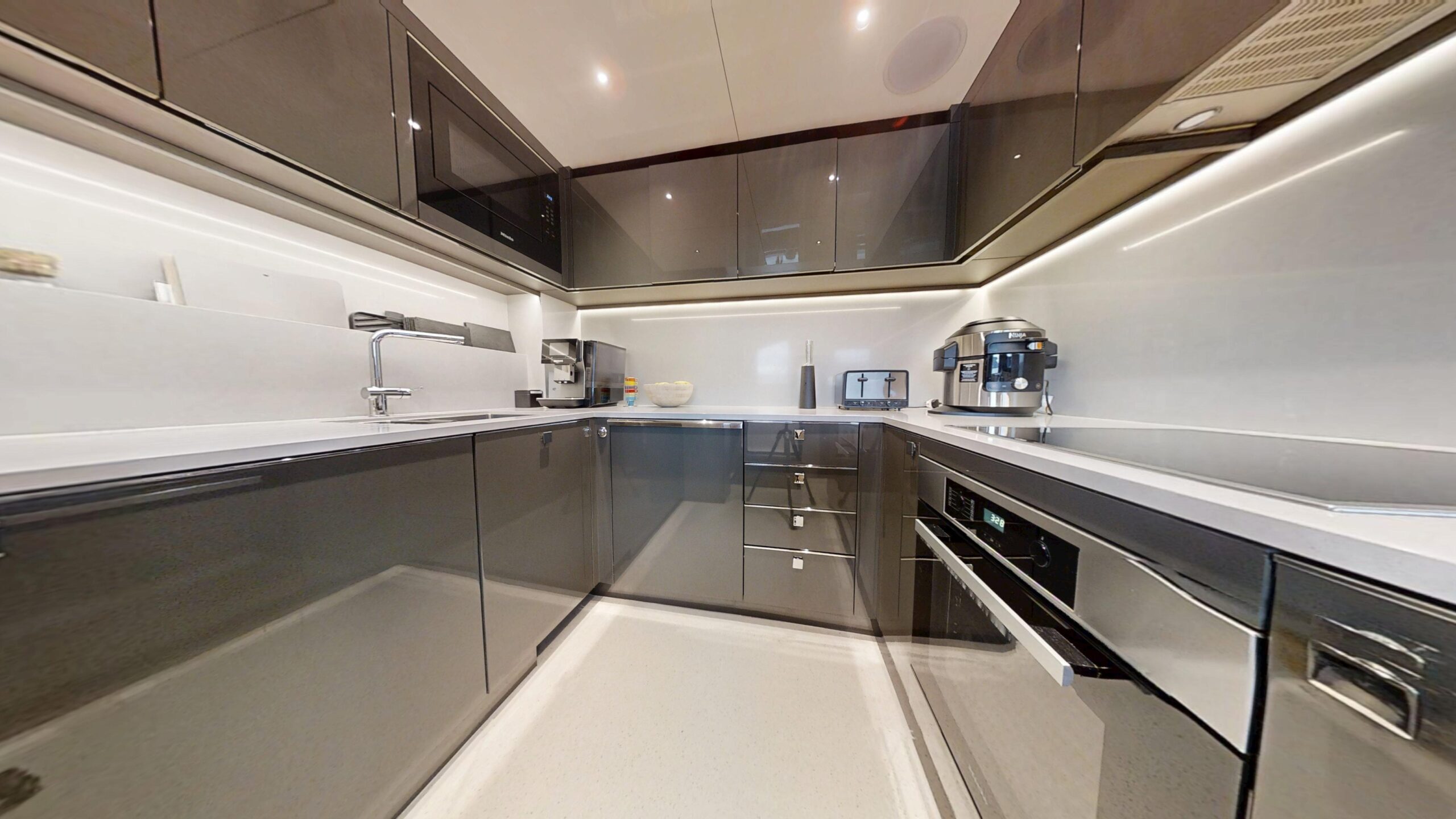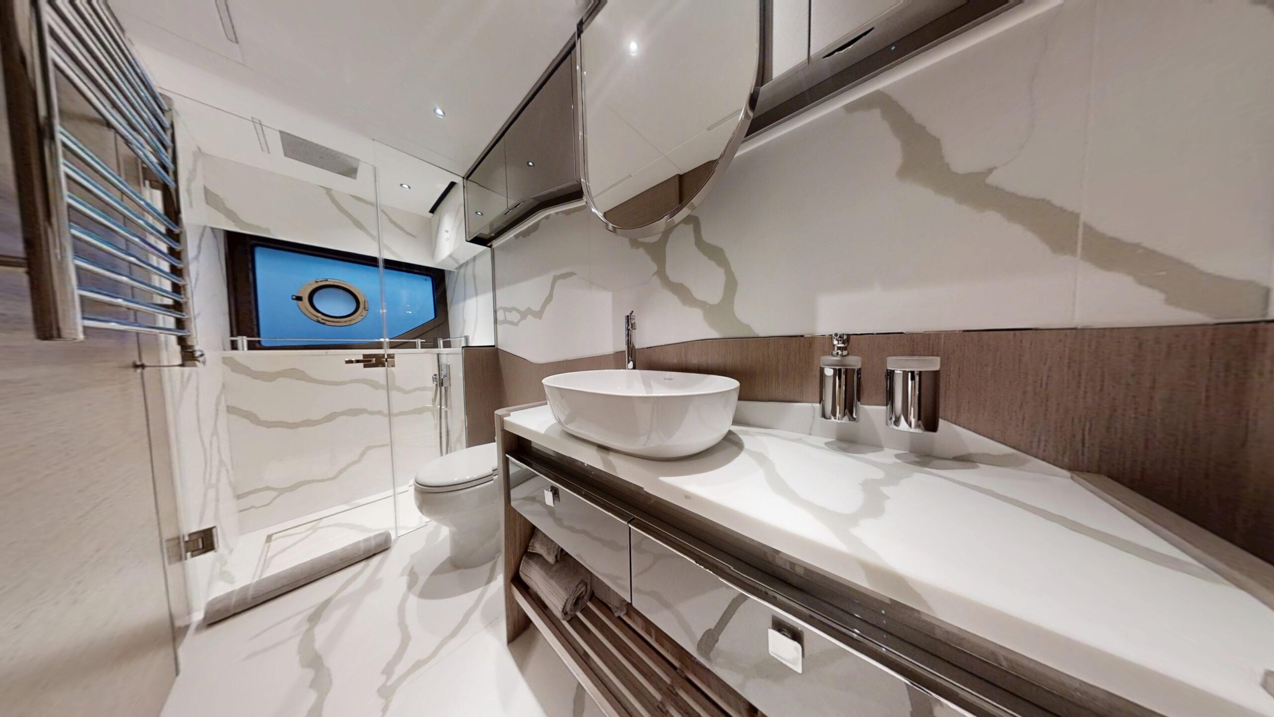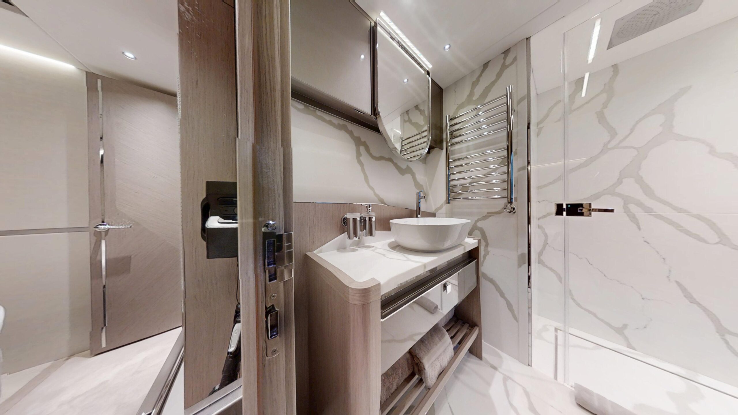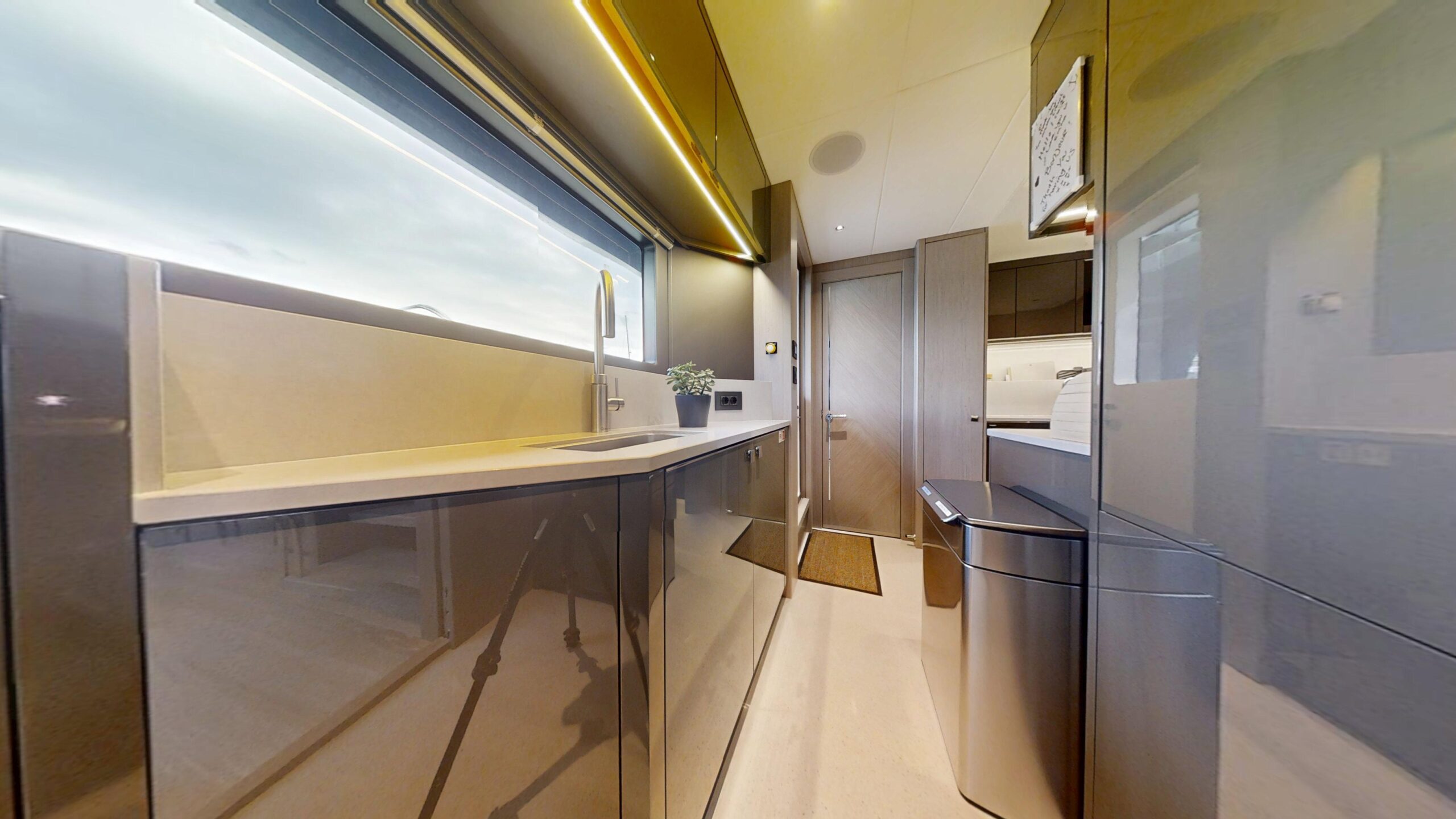 Безусловной изюминкой является мастер-каюта во всю ширину корпуса на главной палубе — с панорамными видами, частной носовой террасой, гардеробной и встроенным рабочим/туалетным столиком. Четыре дополнительные гостевые каюты на нижней палубе обеспечивают комфорт и универсальность для семьи или чартерного использования.