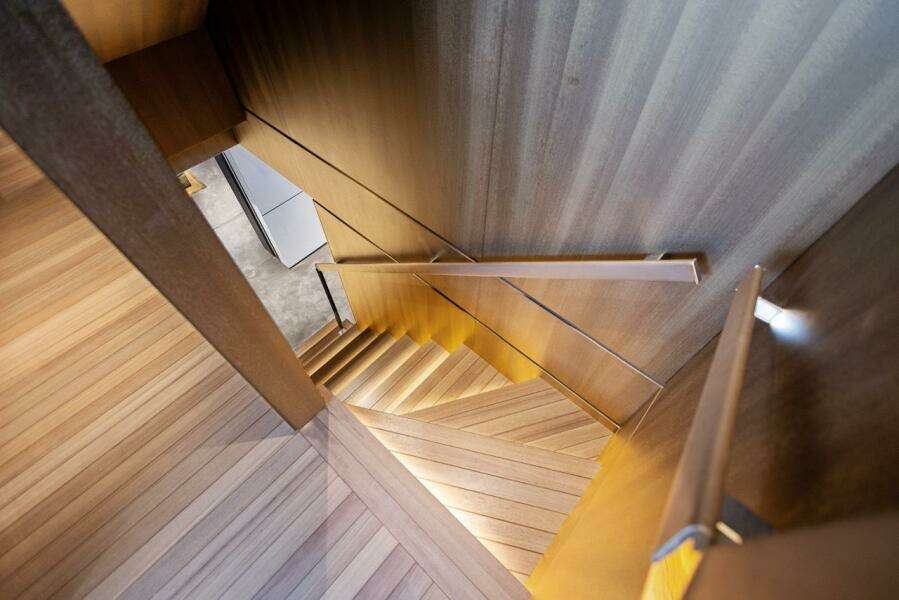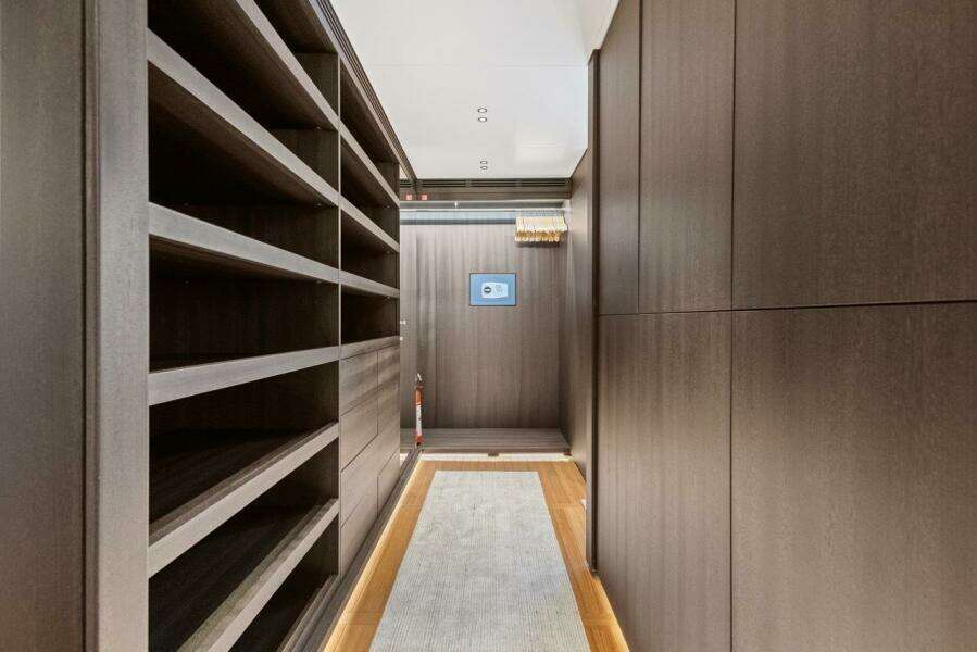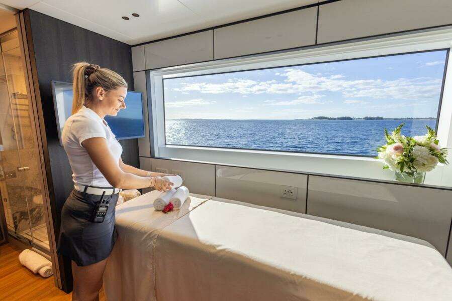 The main salon serves as an elegant gathering space, featuring graceful white serpentine sofas and a striking Onice marble backlit bar. Above, the sky lounge offers an intimate setting for family movie nights, while the wellness cabin provides a private retreat for treatments.