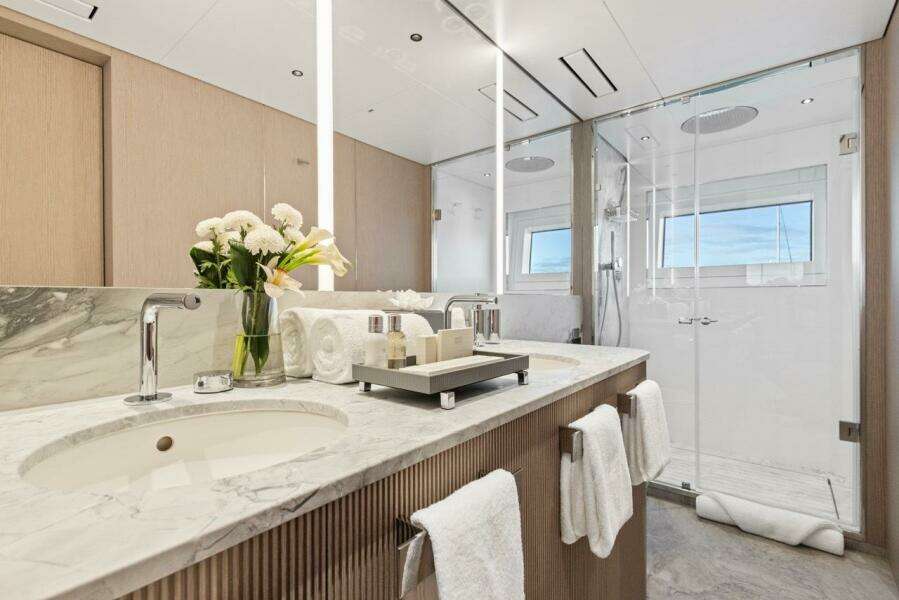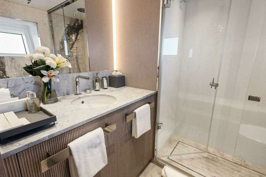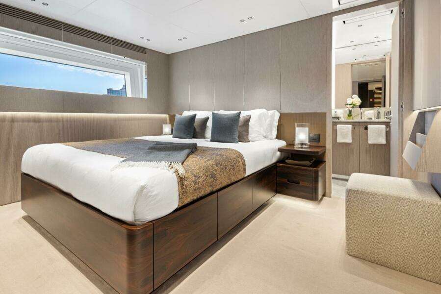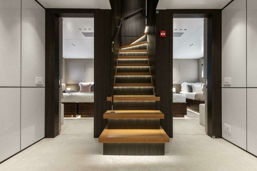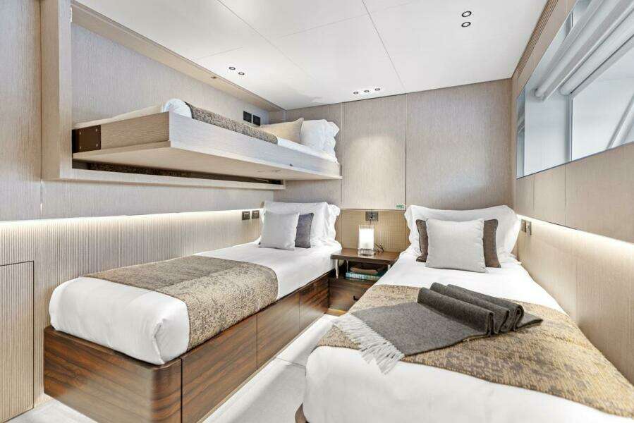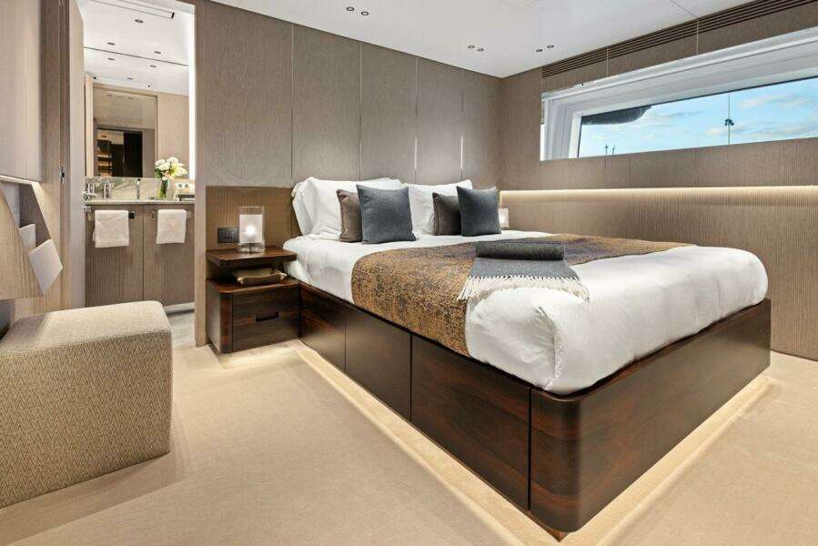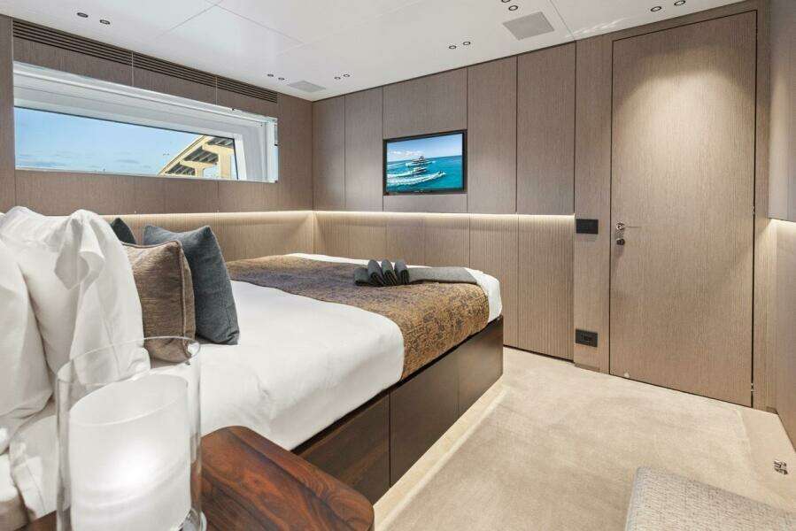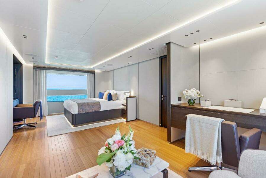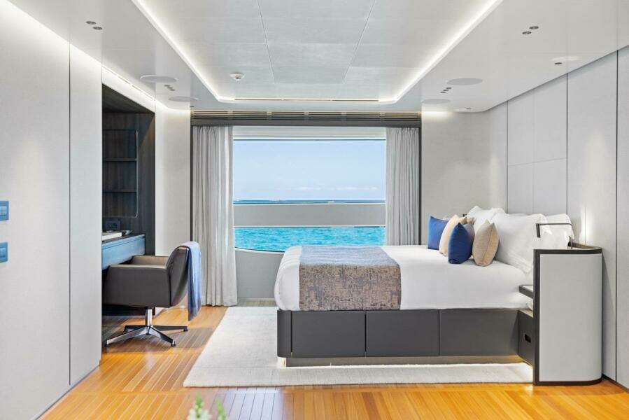 CONTIGO offers refined accommodation for 14 guests. The owner's suite spans the full beam, providing a private sanctuary complete with an elegant salon, dedicated office space, generous dressing room, and luxurious his-and-her bathrooms featuring a steam shower and soaking tub. Two sophisticated VIP cabins and two versatile twin cabins, each with an additional Pullman berth, and a flexible use cabin that functions as a sixth stateroom or wellness room complete the accommodation. A professional crew of nine ensures every detail of your journey is executed with precision.
