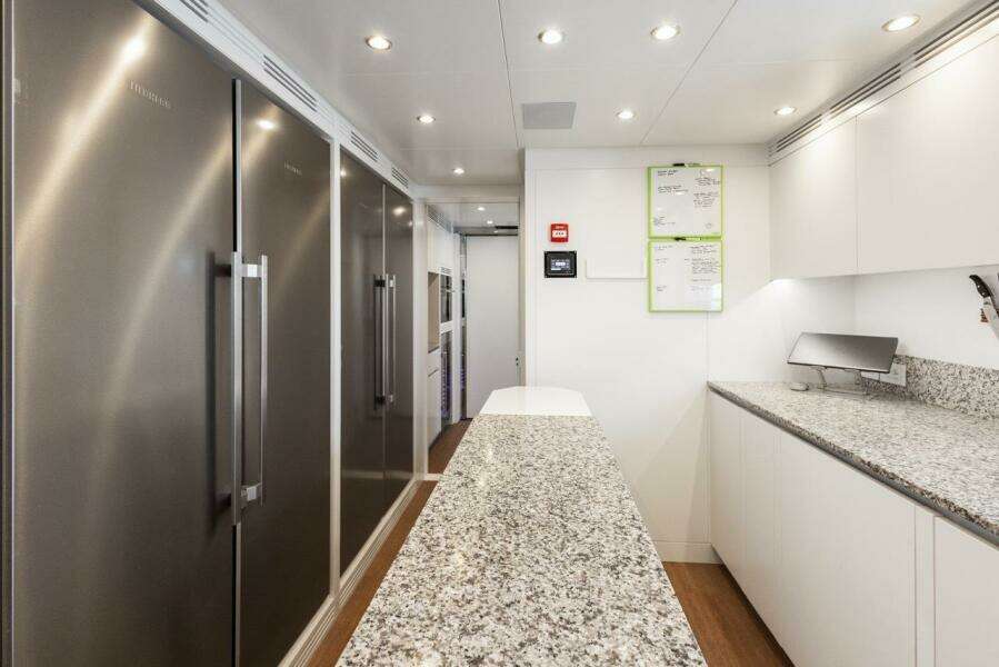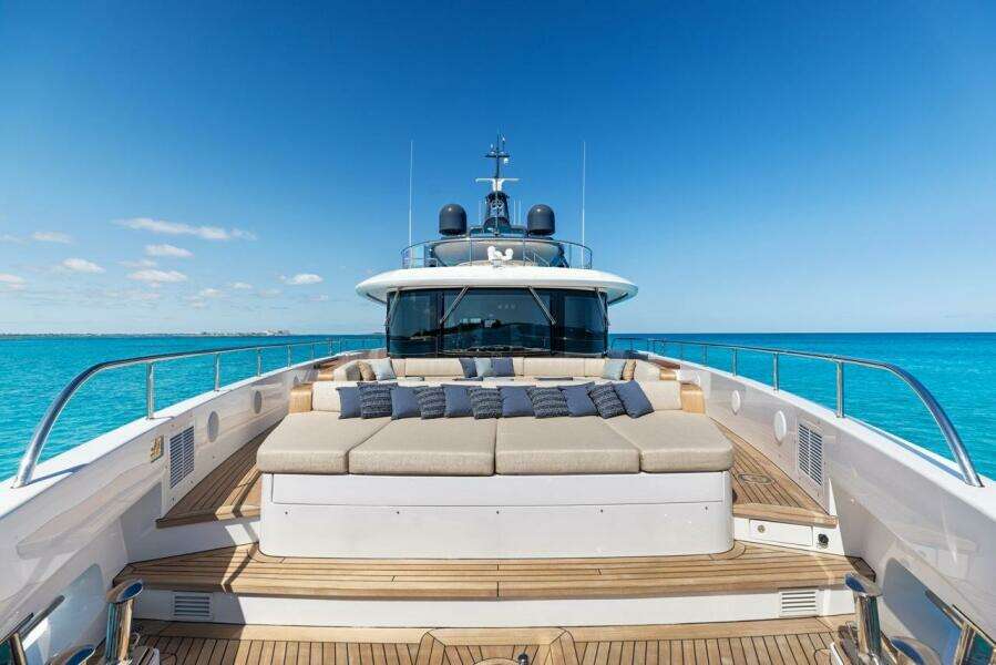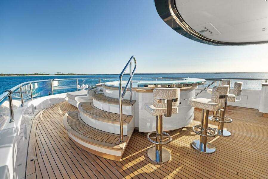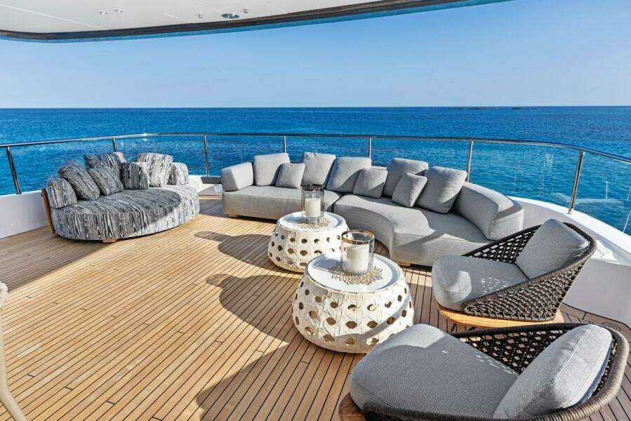 CONTIGO truly distinguishes itself through its exceptional outdoor spaces. The main deck aft functions as a sophisticated beach club, complete with a refreshing pool, generous sunpads, and comfortable lounge areas. The sun deck presents multiple options for entertainment, from sunbathing by the Jacuzzi to enjoying cocktails at the integrated bar or dining beneath the protective hardtop. The aft section transforms into an evening entertainment space with flexible furnishings and professional DJ capabilities. For those seeking tranquility, the foredeck offers additional private sunbathing areas.