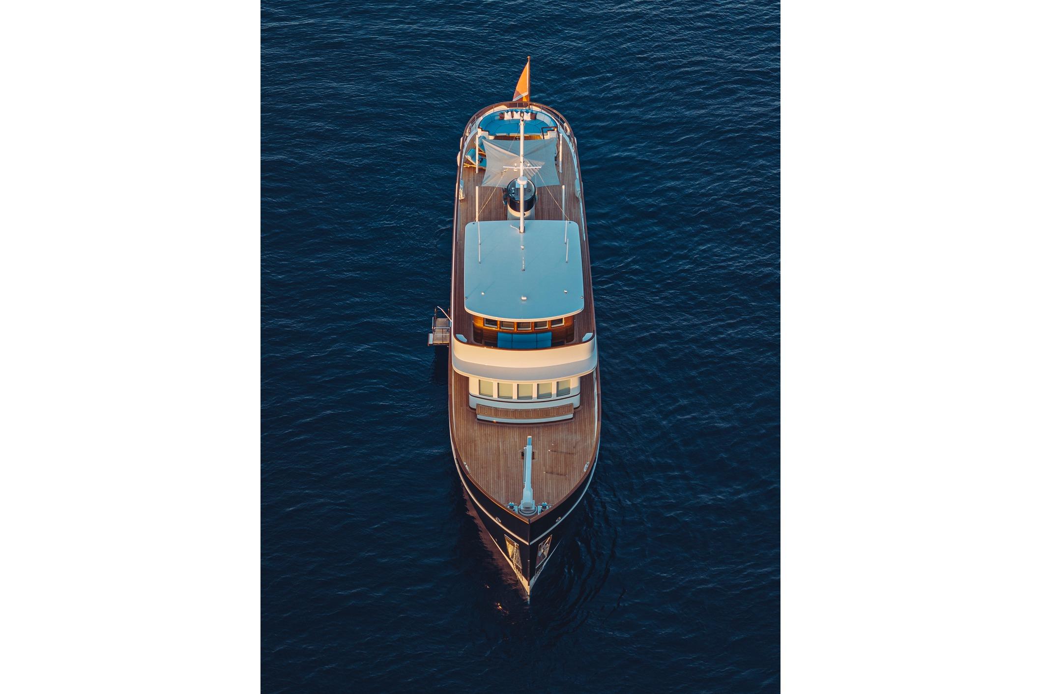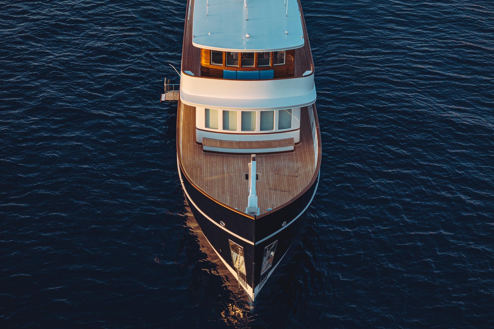 Особого внимания заслуживают изготовленные вручную лакированные махагоновые двери, ведущие на просторную кормовую палубу, уложенную тиком. Это открытое пространство — «сердце» яхты днём: большая теневая маркиза закрывает обеденную зону с тиковым столом и 10 стульями. Также есть большой полулунный санпад на корме и 2 шезлонга-«steamer» для отдыха. Если пройти вперёд от красиво лакированной рубки, вы найдёте скрытую жемчужину — Portuguese bridge с приватными местами для сидения и защитой от стихии благодаря высоким фальшбортам и тиковому планширю.