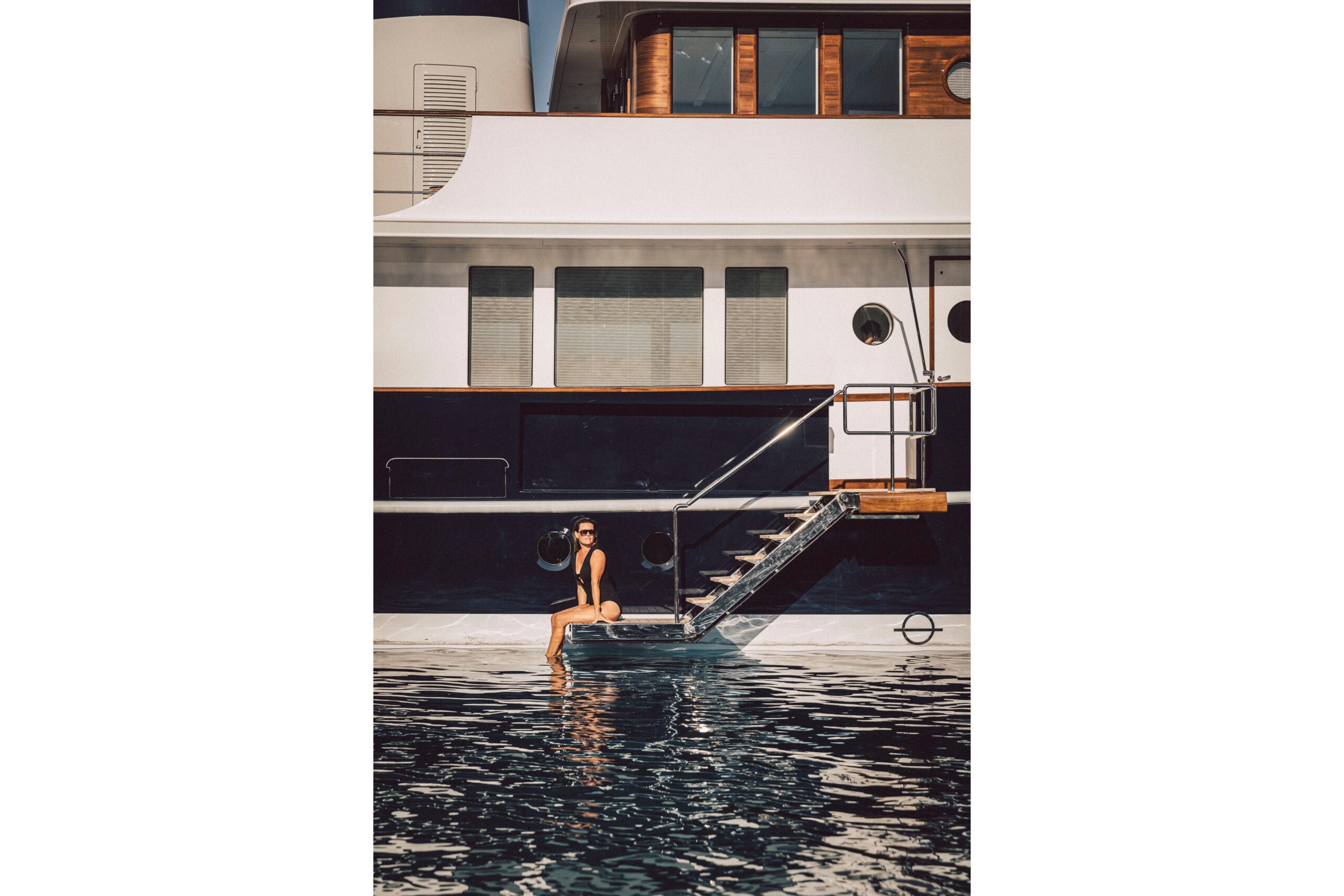 Помимо откидных гидравлических бортовых ступеней по правому борту, подняться на борт можно и через красиво оформленную транцевую «каноэ-корму»: транец опускается, обеспечивая доступ по телескопическому пассарелле.