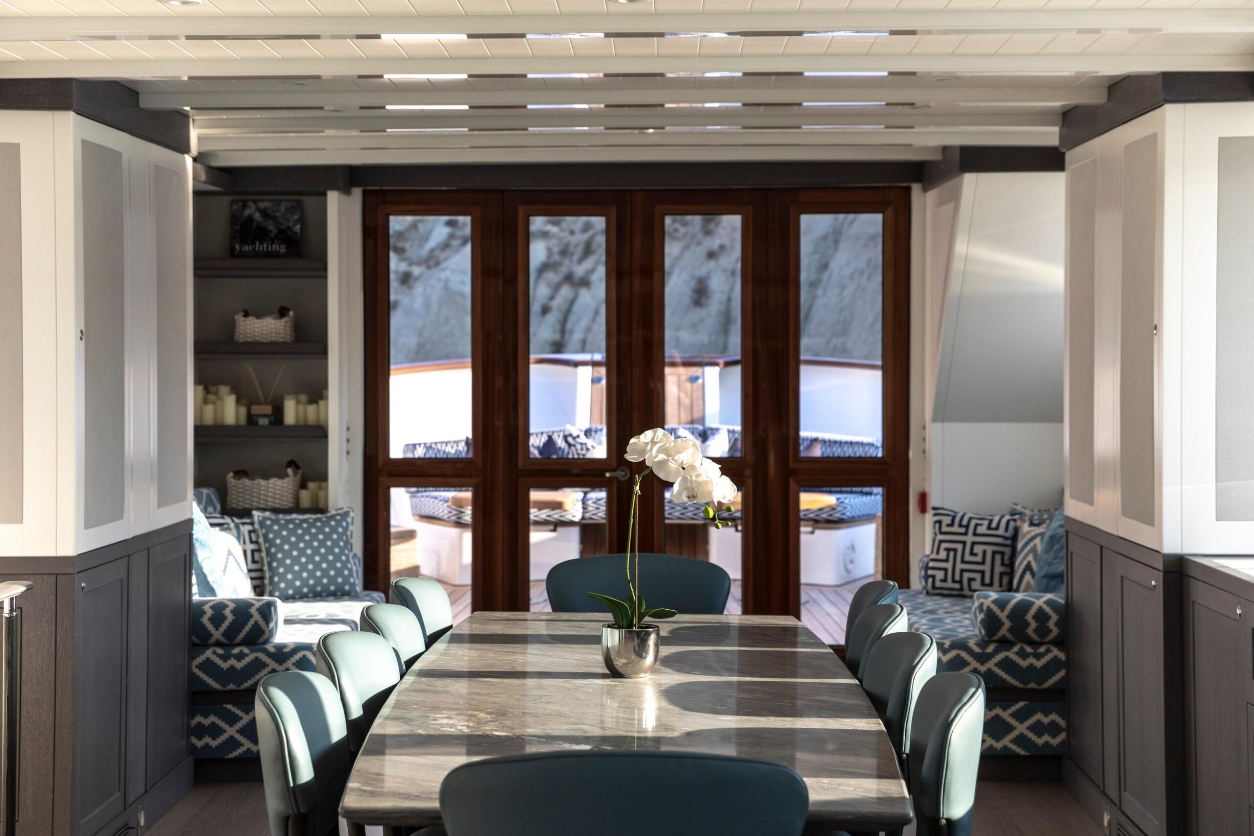 Просторный салон главной палубы доступен через двойные распашные лакированные деревянные двери с кормы. Это большое открытое пространство салон/столовая превосходно освещено по всей длине благодаря обилию крупных окон по обоим бортам, что обеспечивает исключительные виды на стоянку на якоре. Обеденный стол с мраморной столешницей легко размещает 10 человек и находится в центре помещения — отсюда особенно хорошо ощущается «панорамность» пространства. Впереди обеденной зоны — уютная лаунж-зона с длинным L-образным диваном и оттоманкой: идеальное место расслабиться перед телевизором 50" с окружающим звуком Sonos, подключённым к Starlink — гости могут свободно стримить контент по запросу.