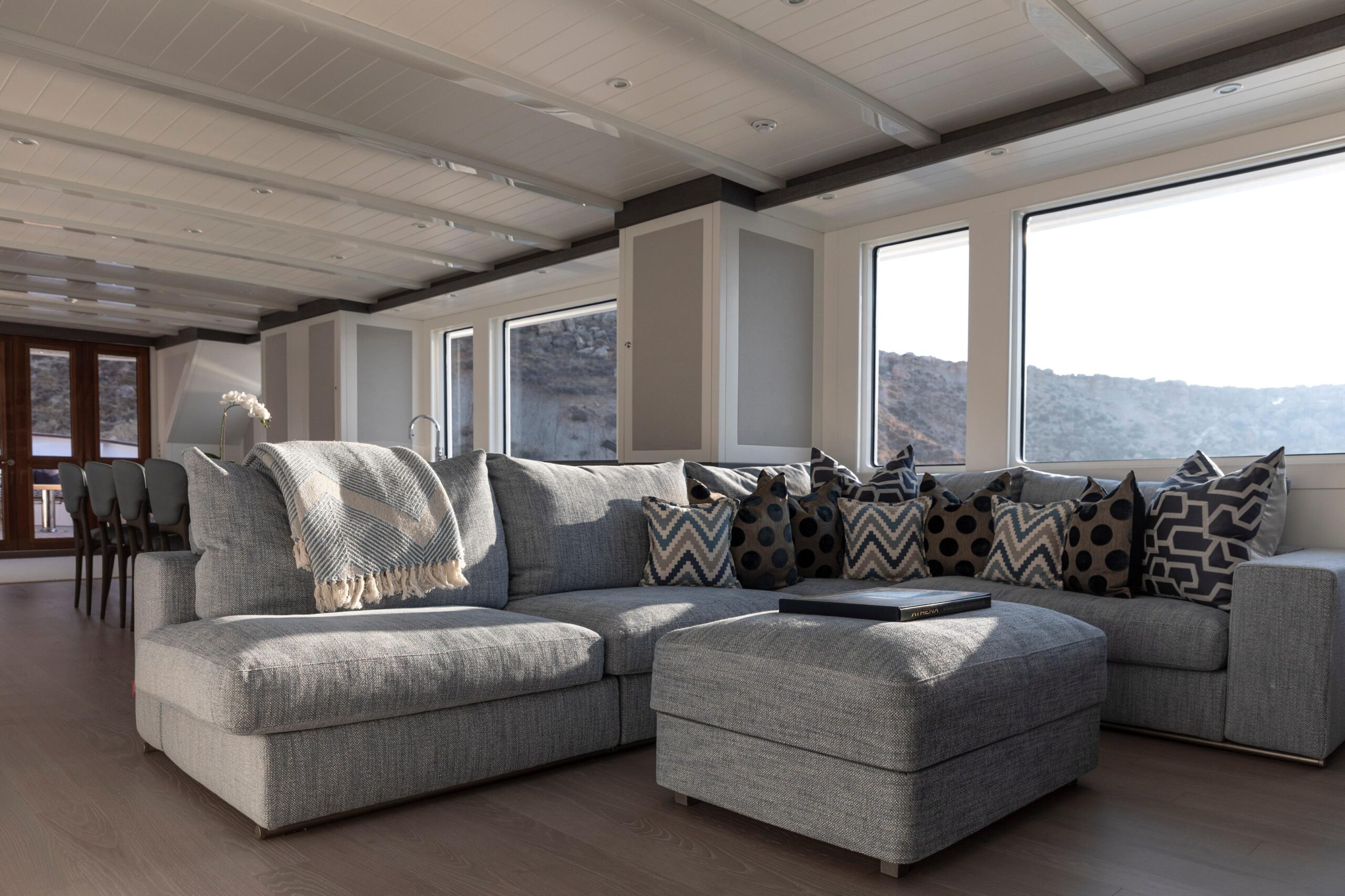 Главный салон организован в виде двух отдельных зон отдыха, между которыми расположен обеденный стол на 10 персон. Второй салон на верхней палубе создаёт дополнительное, более камерное пространство для отдыха.
