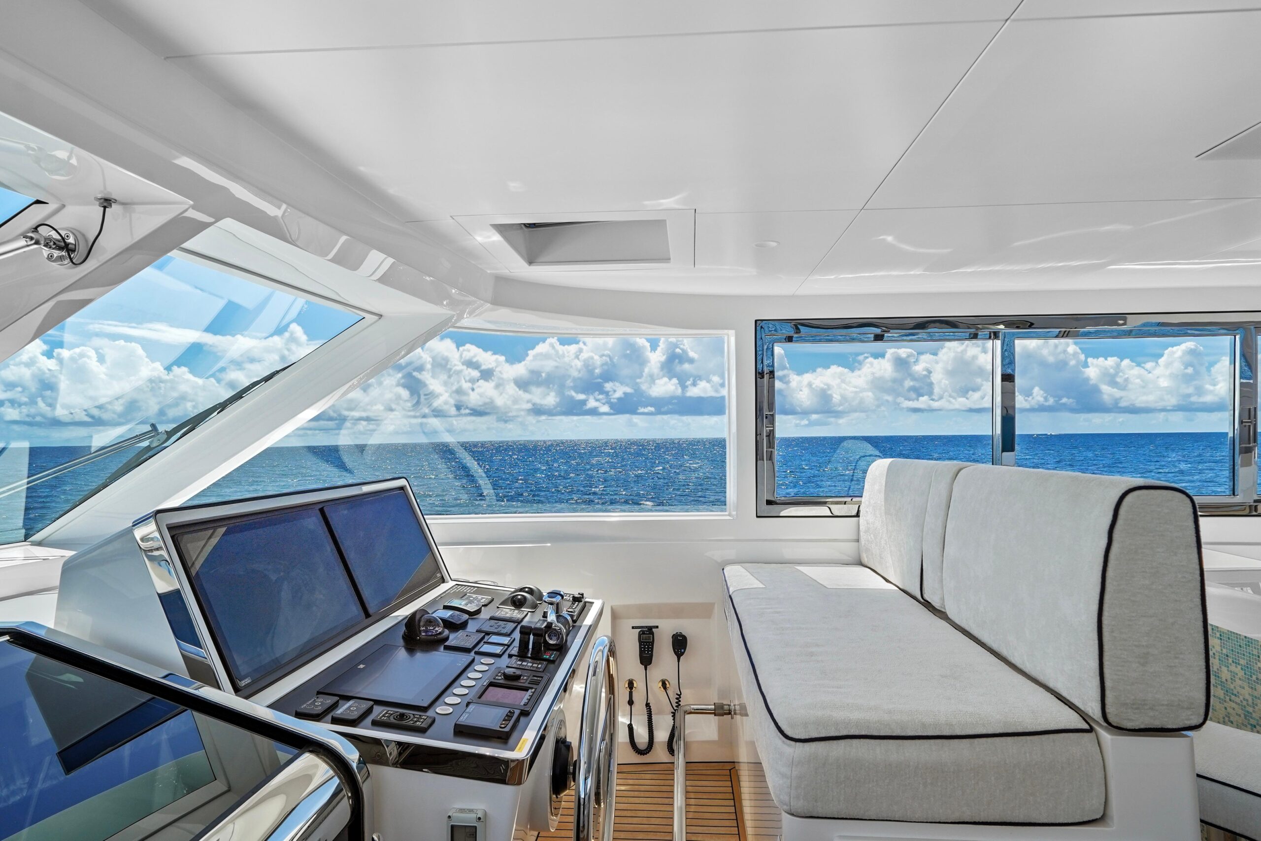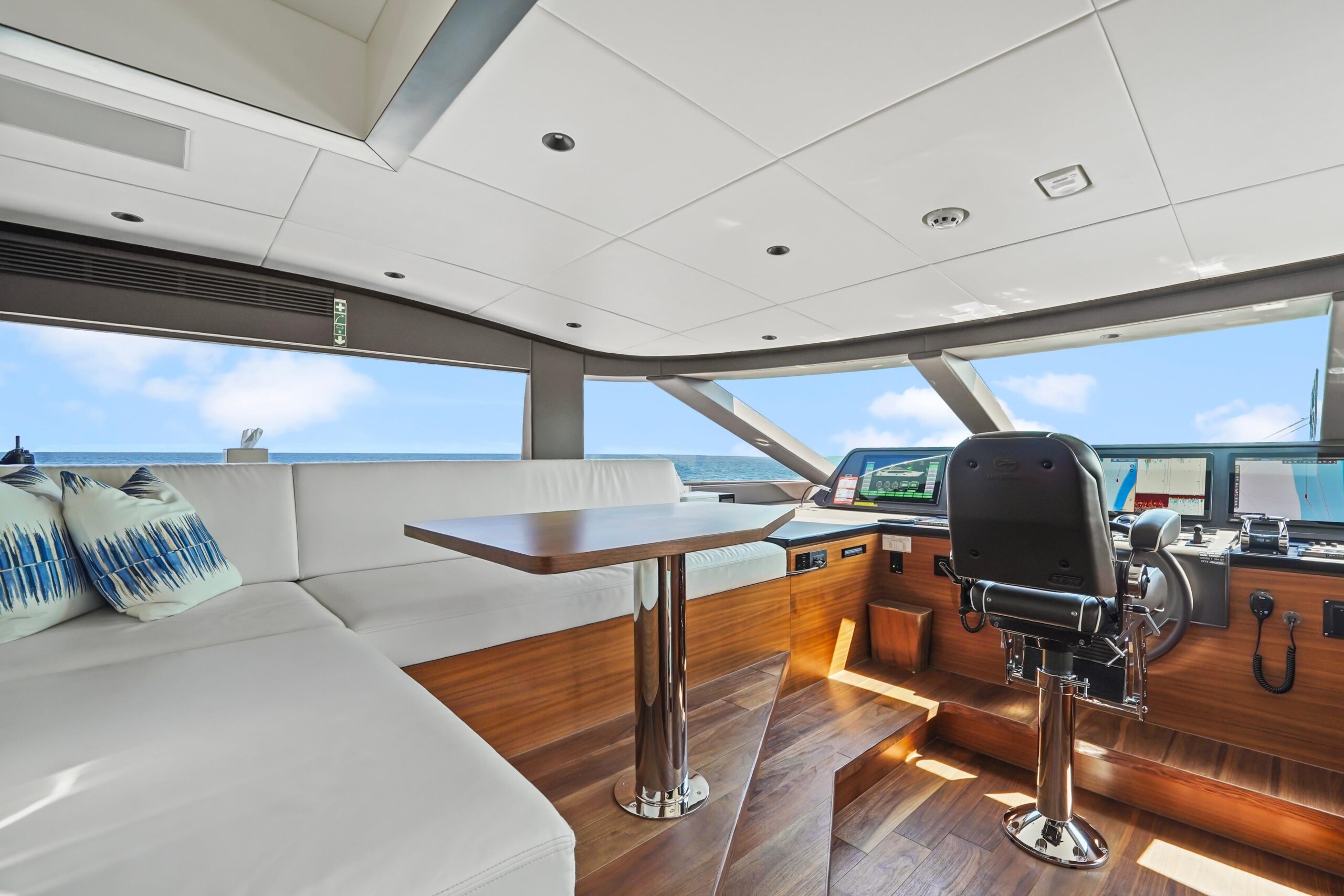 На палубе ходовой рубки raised pilothouse расположен полноценный навигационный пост и кастомное кресло Stidd у штурвала, рядом — уютная L-образная зона дивана со столом. С кормы флайбридж открывает панорамный обзор: второй пост управления, L-образный бар с мозаичной отделкой и шестью барными стульями, большой ТВ для развлечений на открытом воздухе. Для сервиса предусмотрены винный шкаф Sub-Zero, холодильник, льдогенератор, мойка и скрытый 24" пропановый гриль BBQ.