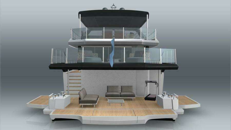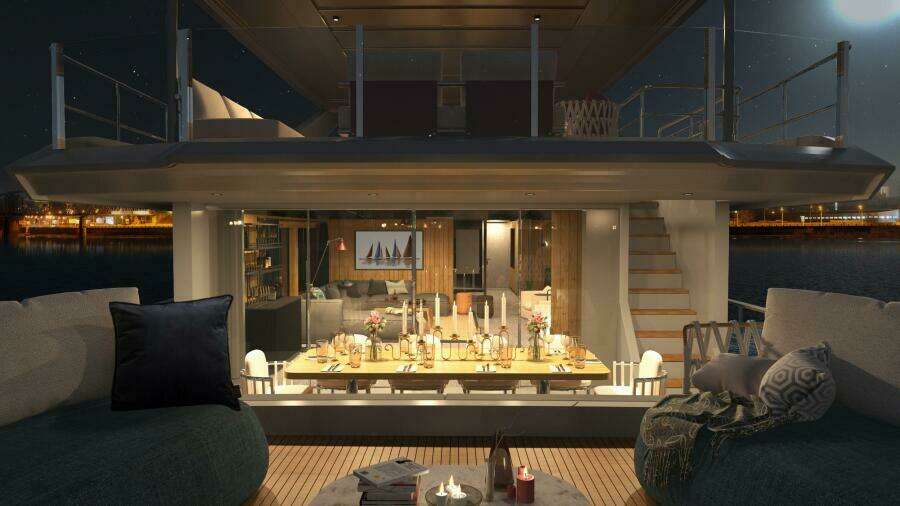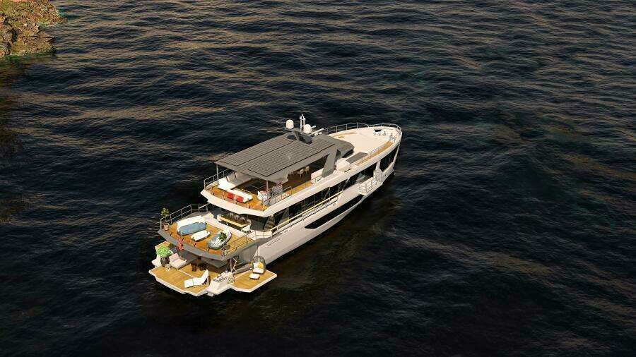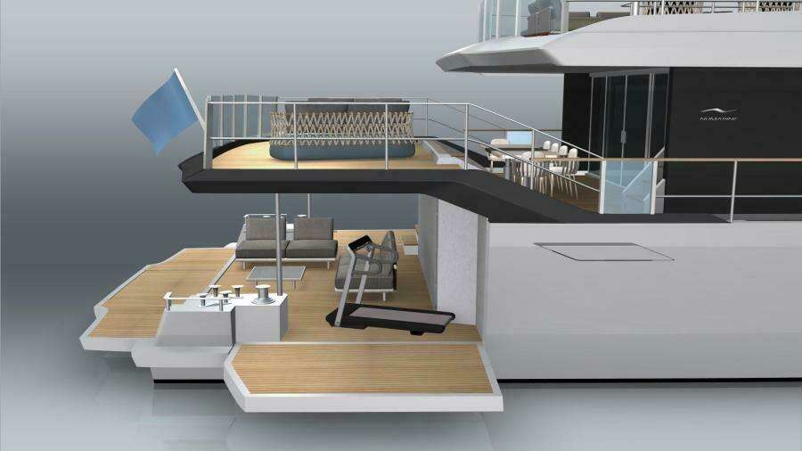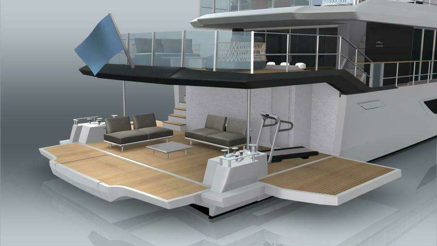 Просторный пляжный клуб в корме с полуоткрытой планировкой и увеличенной высотой потолков был реализован за счёт приподнятой палубы выше, которая образует зону отдыха всего в трёх ступенях над уровнем главной палубы. Три откидные платформы увеличивают площадь пляжного клуба до внушительных 43 м². Боковой гараж позволяет разместить тендер длиной до 6,25 м.