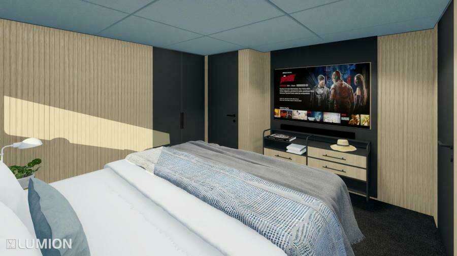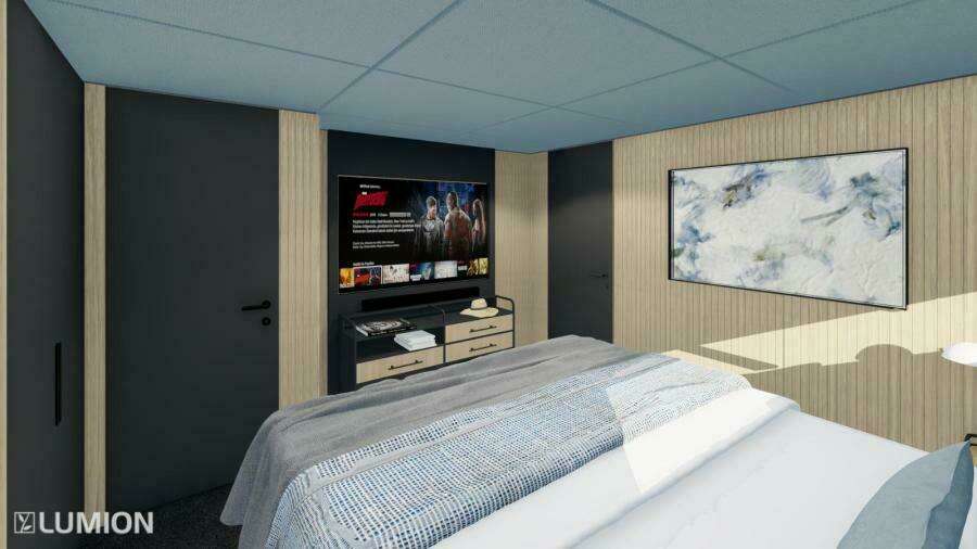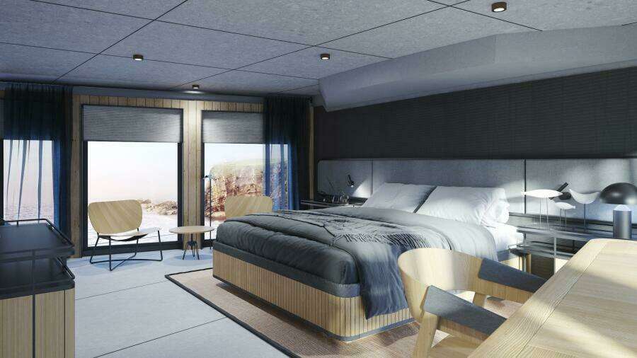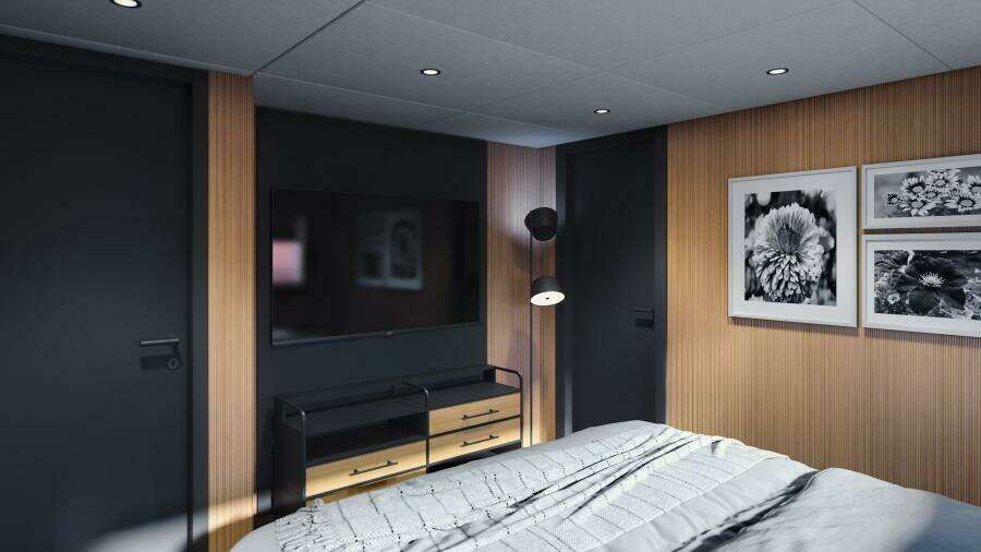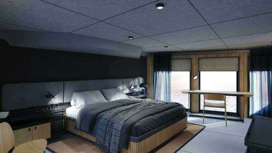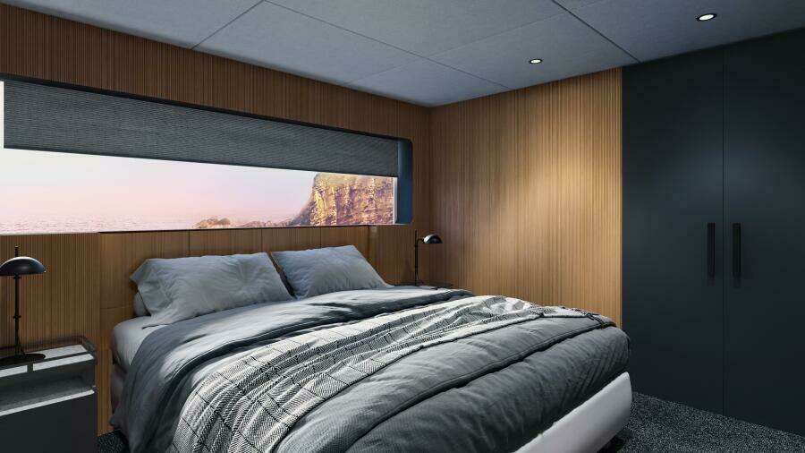 30XP рассчитана на размещение 10 гостей в 5 каютах с собственными ванными комнатами: четыре гостевые каюты расположены на нижней палубе, а мастер-каюта — в носовой части главной палубы с панорамными окнами от пола до потолка и вырезами в фальшбортах для максимального обзора моря. Для мастер-каюты также доступен опциональный откидной балкон.
