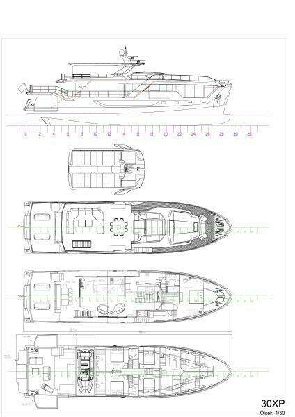 Для максимально эффективного использования объёма 30XP выполнена в компоновке с приподнятой рубкой и выразительным экстерьером от Can Yalman. На носовой палубе перед рубкой расположена большая зона для загара. Камбуз экипажа и размещение пяти членов команды находятся в носовой части нижней палубы.