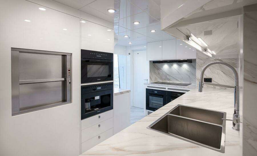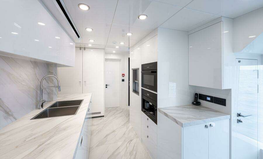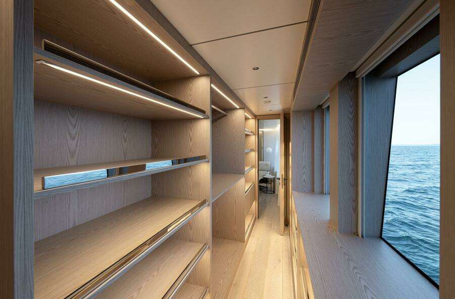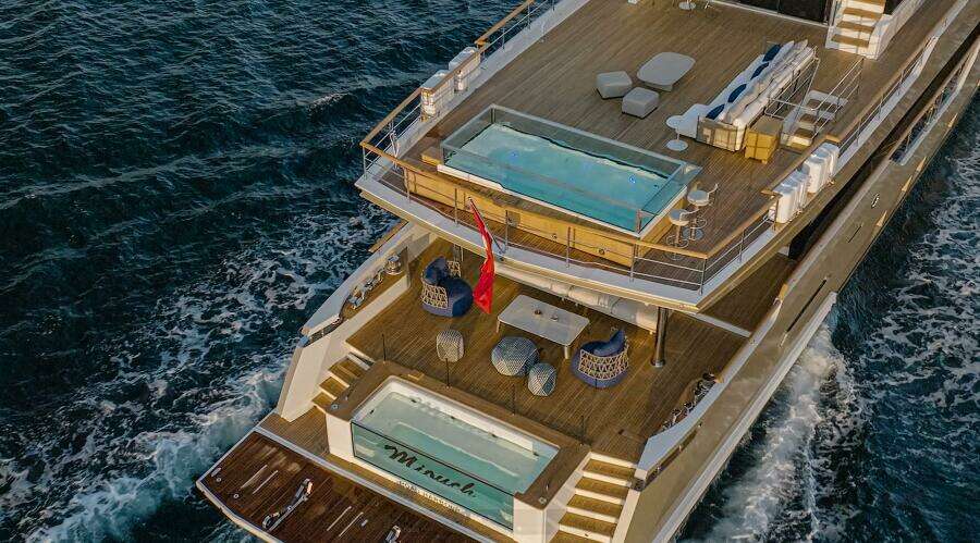Планировка сандэка, boat deck и варианты интерьера, представленные в модели 37XP, сохраняются и в 40MXP; единственное существенное изменение находится в кормовой части яхты (у транца).