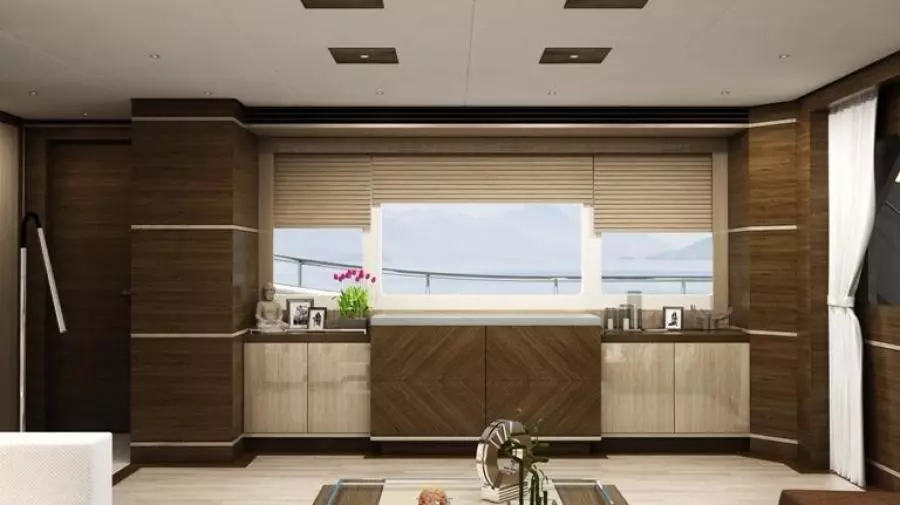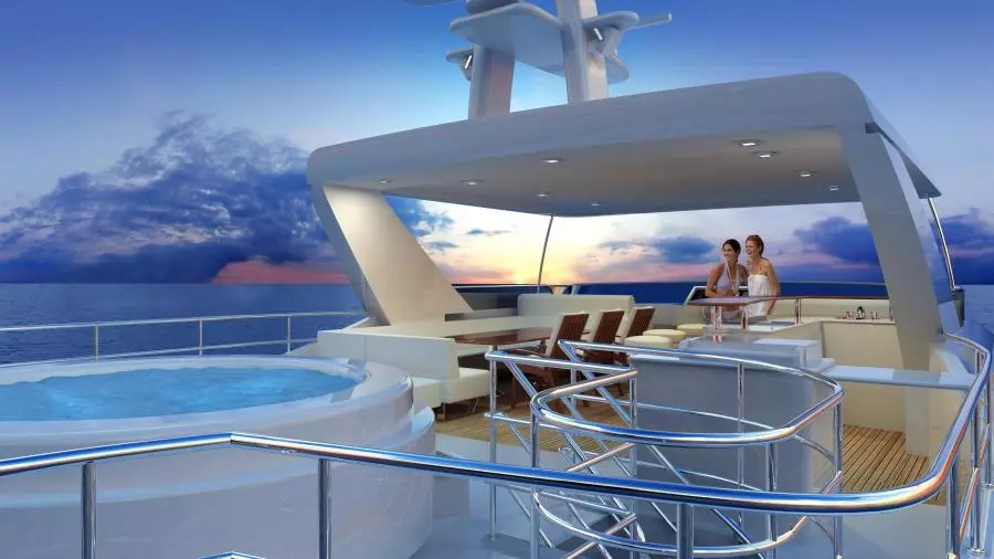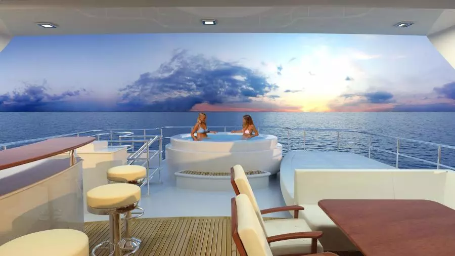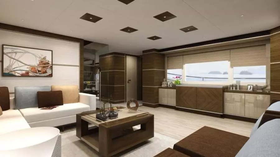 Можно организовать большую ТВ/лаунж-зону с раскладным диваном queen-size и полноценным санузлом, сохранив пятую гостевую каюту. Это позволяет либо создать бар/игровую комнату на месте кормового салона, либо сохранить салон и получить две лаунж-зоны. Также возможна большая офисная зона.