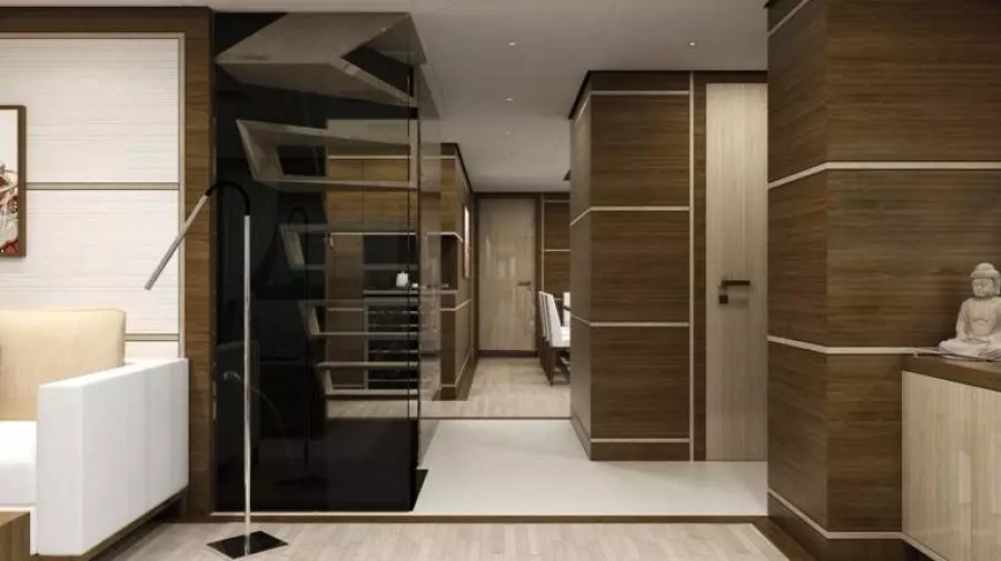 Вестибюль главной палубы разделяет кормовой салон и формальную обеденную зону. Здесь же — выход на боковую палубу, дневной санузел и мокрый шкаф.