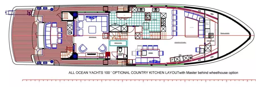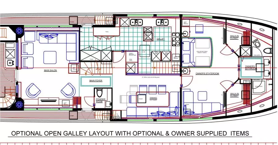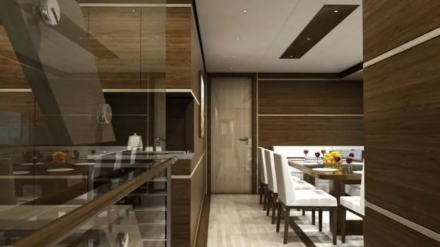 Стандартная планировка главной палубы включает мастер-каюту на главной палубе и закрытую камбузную зону. Альтернативный вариант сохраняет ту же компоновку, но предлагает раздвижную перегородку между камбузом и обеденной зоной, создавая формат открытого камбуза. Также изменяется конфигурация одного из холодильников, духовок и буфета для посуды, что позволяет полностью открыть пространство.
