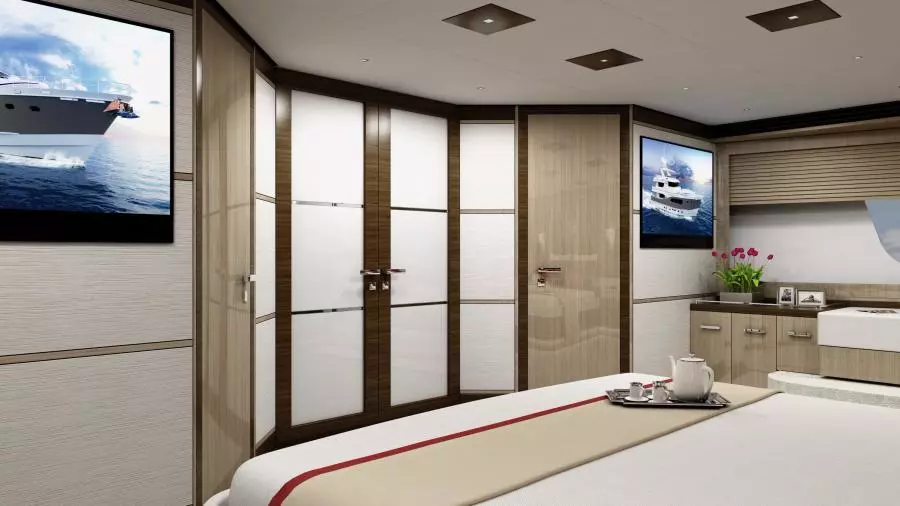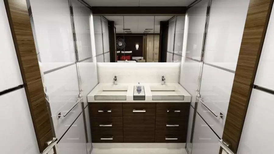Перегородка между мастер-каютой и камбузом выполнена из стали с шумоизоляцией для пожарной безопасности и приватности. Из каюты предусмотрен аварийный выход на лодочную палубу.
