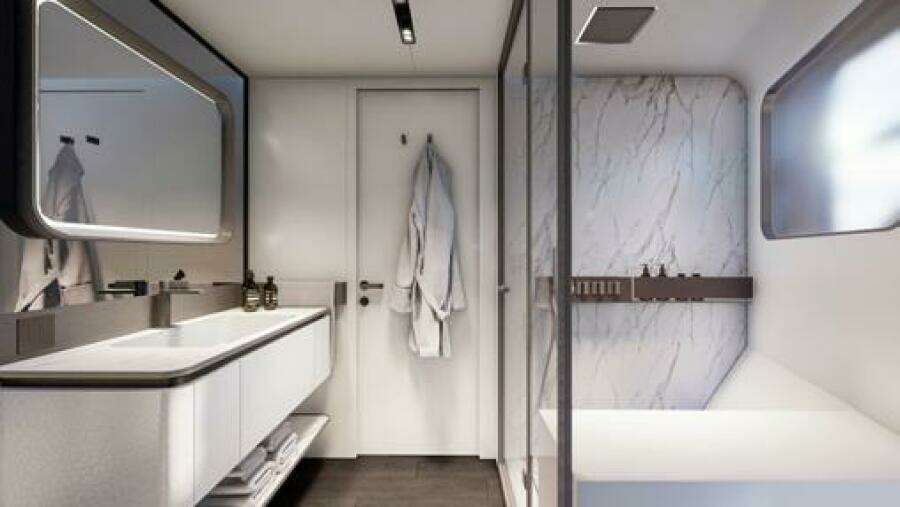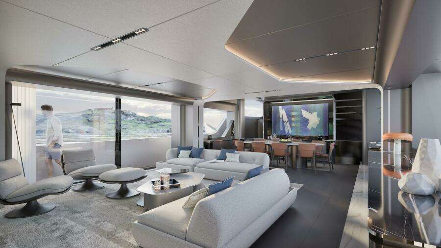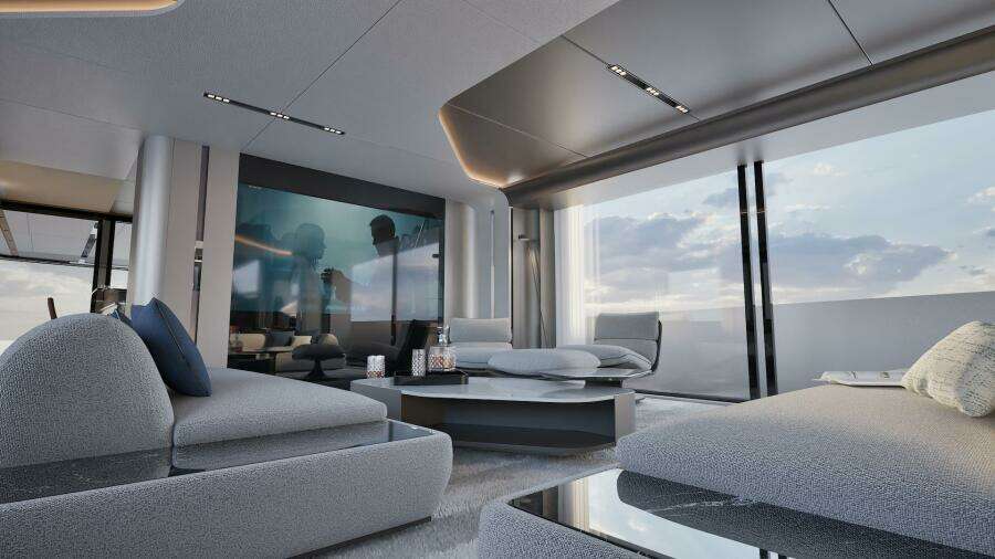 Чтобы максимально увеличить внутренний объём, предусмотрен всего один проход к носу по левому борту; а в средней части, рядом с салоном, есть открывающийся балкон, позволяющий любоваться видом даже из внутренних диванов.