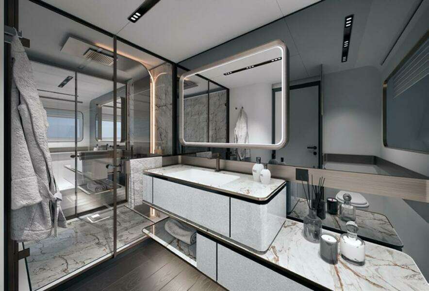 Сан-дек с карбоновым хардтопом включает второе место управления и образует приватное, многофункциональное пространство для гостей. Планировка предусматривает два больших лежака для загара в корме, лаунж-зону с диванами, бар Г-образной формы и стол на 12 персон.